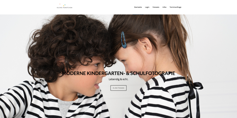 What we love: Janine Wienieck’s Kleine Pünktchen is a great example of a professional website for a school or nursery photographer. From the first glance, Janine’s branding is clear and the visitor forms an emotional connection from the automatic video on the homepage. After a quick scroll, the visitor reaches her portfolio. The majority of the featured children wear black and white stripes, one of the main characteristics of Kleine Pünktchen. Together with the alternating black and white background, it creates a unified overall atmosphere to the website. What we particular like is the FAQ question and the contact form at the bottom of the homepage.