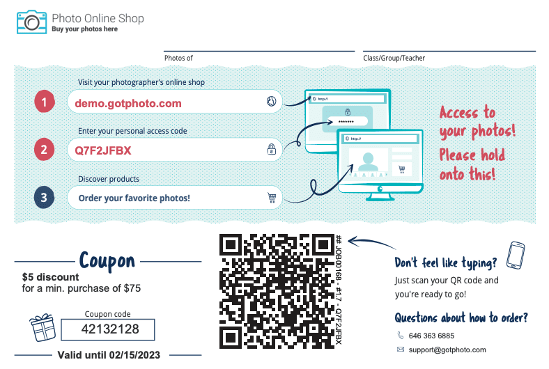 - Parents can then use the password on their card to log in to their personal online store where they will see all their child’s images. If using their phone, they can simply scan the QR code where they will then be automatically directed to their online shop.