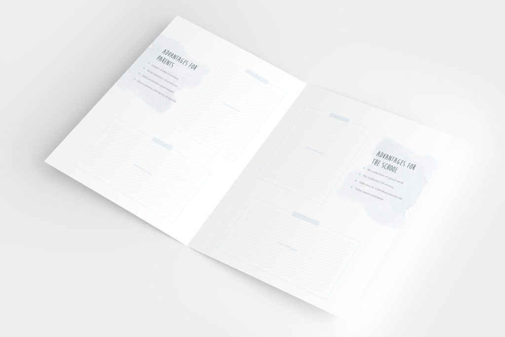 - On the front and two inside pages, you will find a total of five photo spots, in the formats 10x15cm, 13x13cm, or 13x18cm. You can therefore customise the folder yourself easily and quickly.