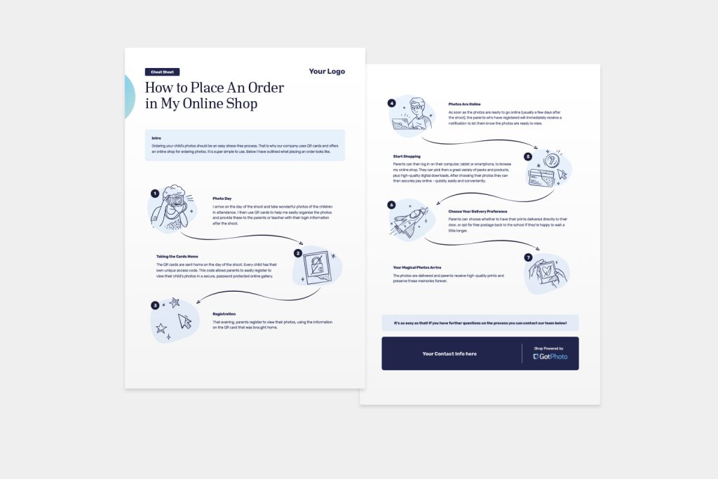 It is always important that you leave a positive impression with parents, schools and nurseries, so that is why we created this easy explainer material for how parents can place an order using your shop with GotPhoto. Take this along with you when you visit an establishment and show just how simple this process is. Better yet, this Photoshop file can be downloaded and customised with your logo and contact details for an even better impression.